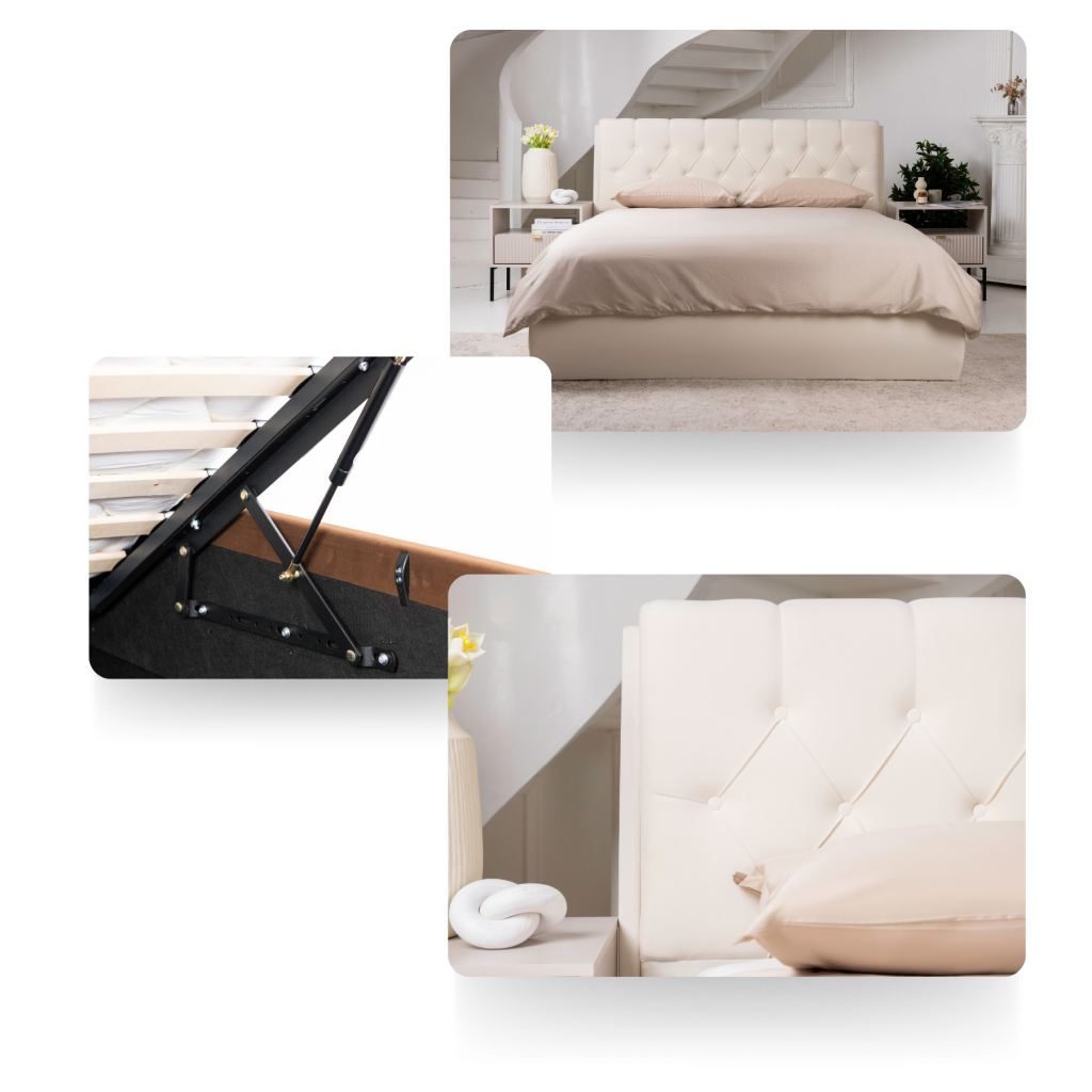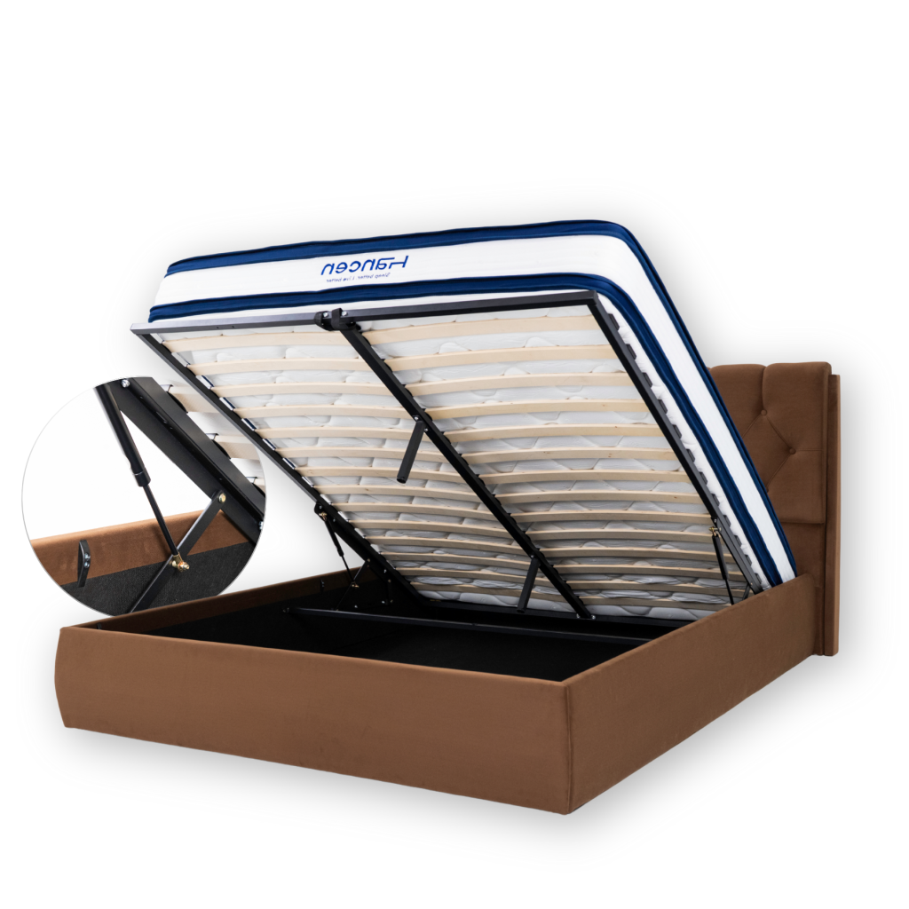 Tvirta konstrukcija su patikimu rėmu, o dujinis pakėlimo mechanizmas veikia tyliai ir sklandžiai – be jokio vargo pakelsite čiužinį ir pasieksite viską, ko reikia. Dujiniai mechanizmai leidžia sustabdyti rėmą bet kurioje padėtyje, nereikia kelti iki pat viršaus, kad užsifiksuotų.
